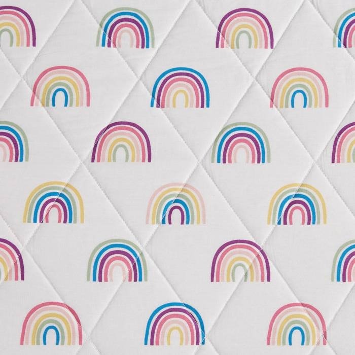 This Full/Queen 3 Piece Pink Rainbows Reversible Cotton Quilt Set adds a bright, playful accent to any bedroom with its colorful two-tone pink/white stripe pattern on one side and a bold print on the reverse. It includes a quilt with a noticeable diamond weave along with two coordinating shams.. Each item is made from a breathable cotton fabric that arrives pre-shrunk and is good for all seasons. This set is non-pilling, so it stands up to frequent use and multiple trips through the washing machine.