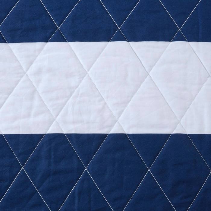 This Full/Queen 3 Piece Coastal Reversible Navy/White Sharks Cotton Quilt Set adds a bright, playful accent to any bedroom with its colorful two-tone navy/white stripe pattern on one side and a bold print on the reverse. It includes a quilt with a noticeable diamond weave along with two coordinating shams.. Each item is made from a breathable cotton fabric that arrives pre-shrunk and is good for all seasons. This set is non-pilling, so it stands up to frequent use and multiple trips through the washing machine.